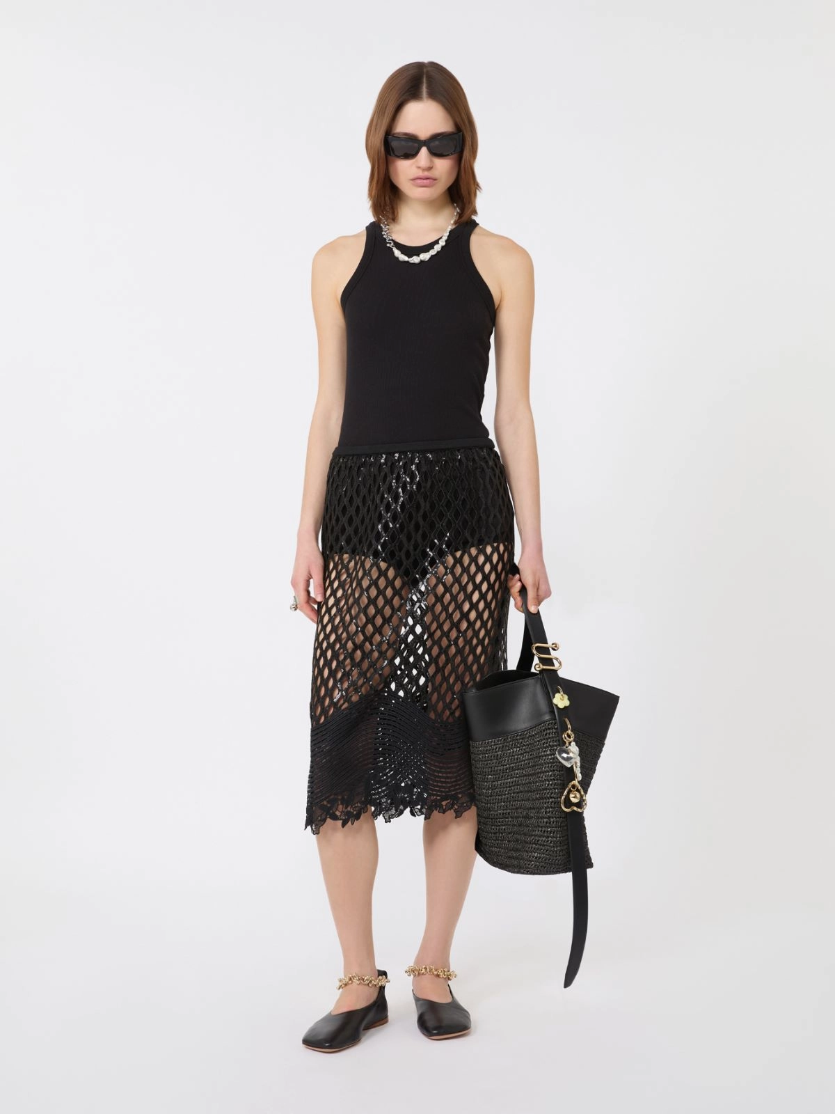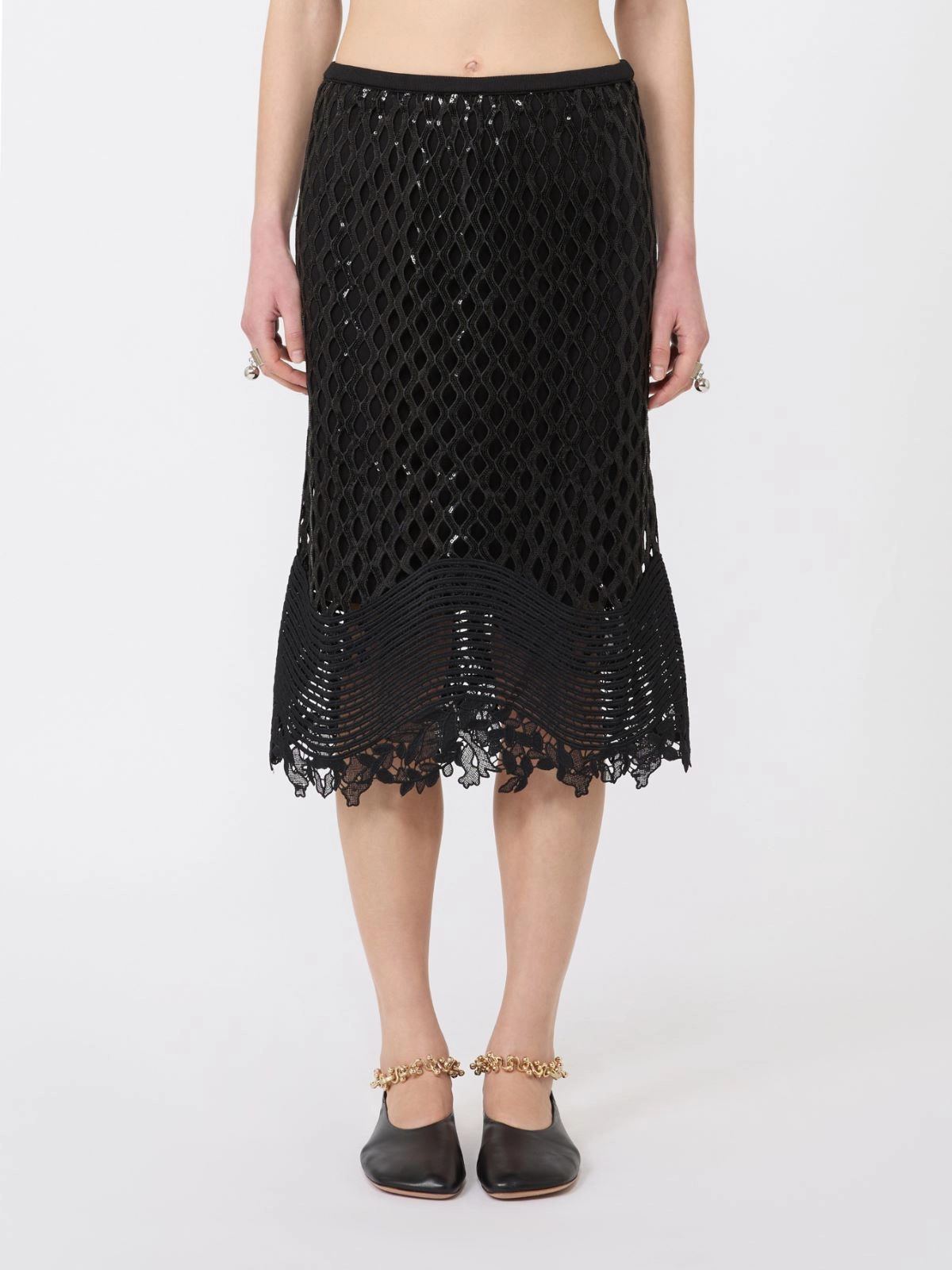 - Sequinned mesh skirt with a macramé trim