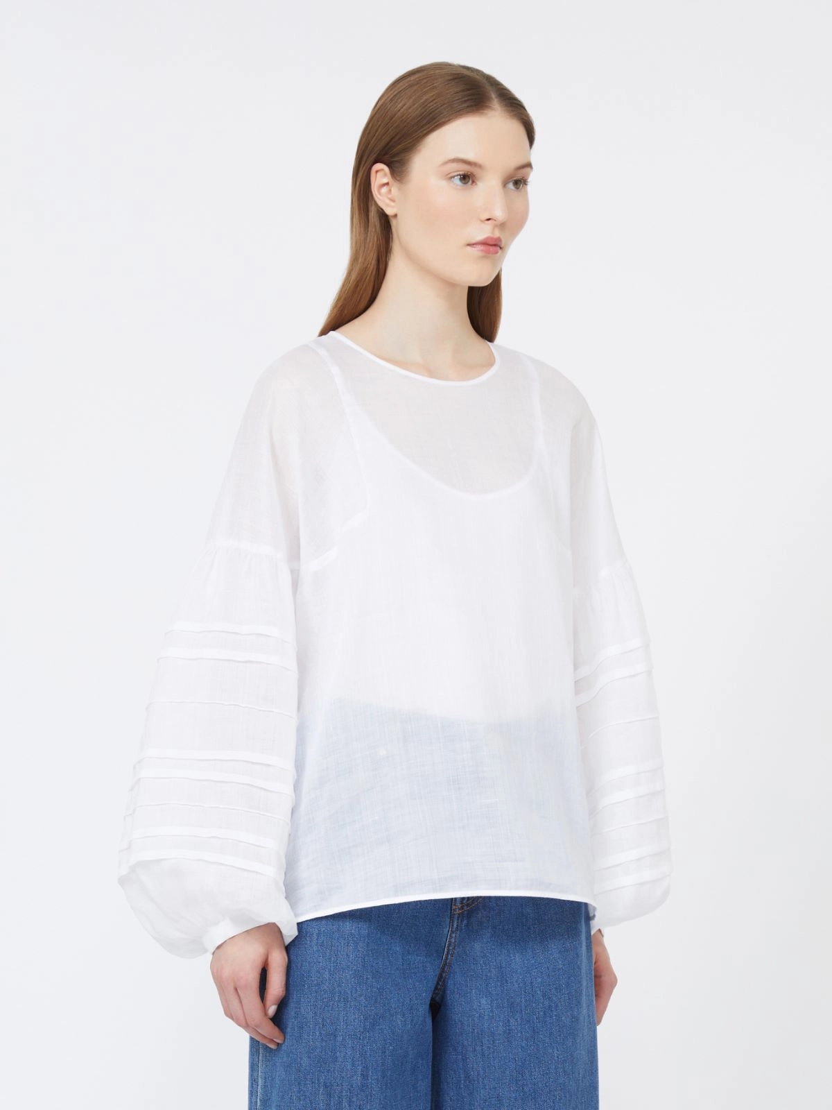 Blouse featuring loose-fitting sleeves, complete with small topstitched horizontal pleats and metal sphere button detail on the cuffs.